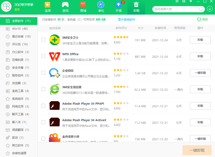 6.【卸载】是我们经常需要用到的功能,点击【一键卸载】软件卸除让电脑干干净净